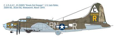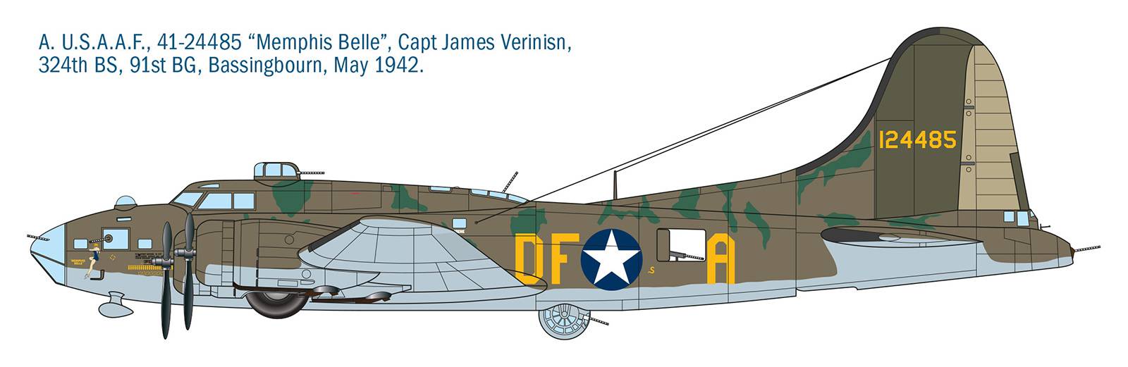 Le bombardier lourd quadrimoteur Boeing B-17 “Flying Fortress” a été largement utilisé par l’United States Army Air Force pendant la Seconde Guerre Mondiale. Produit en grand nombre, il fut principalement engagé par la 8th Air Force pour des missions de bombardement stratégique de jour sur le front européen, avec le soutien d’une escorte de chasseurs à long rayon d’action. Par rapport aux versions précédentes, le B-17F se distinguait par une autonomie accrue, une capacité d’emport de bombes plus importante, ainsi qu’un armement défensif renforcé, composé de dix mitrailleuses calibre .50. Les équipages appréciaient particulièrement la robustesse du B-17 “Flying Fortress”, capable de regagner sa base même après avoir subi d’importants dommages infligés par l’ennemi.